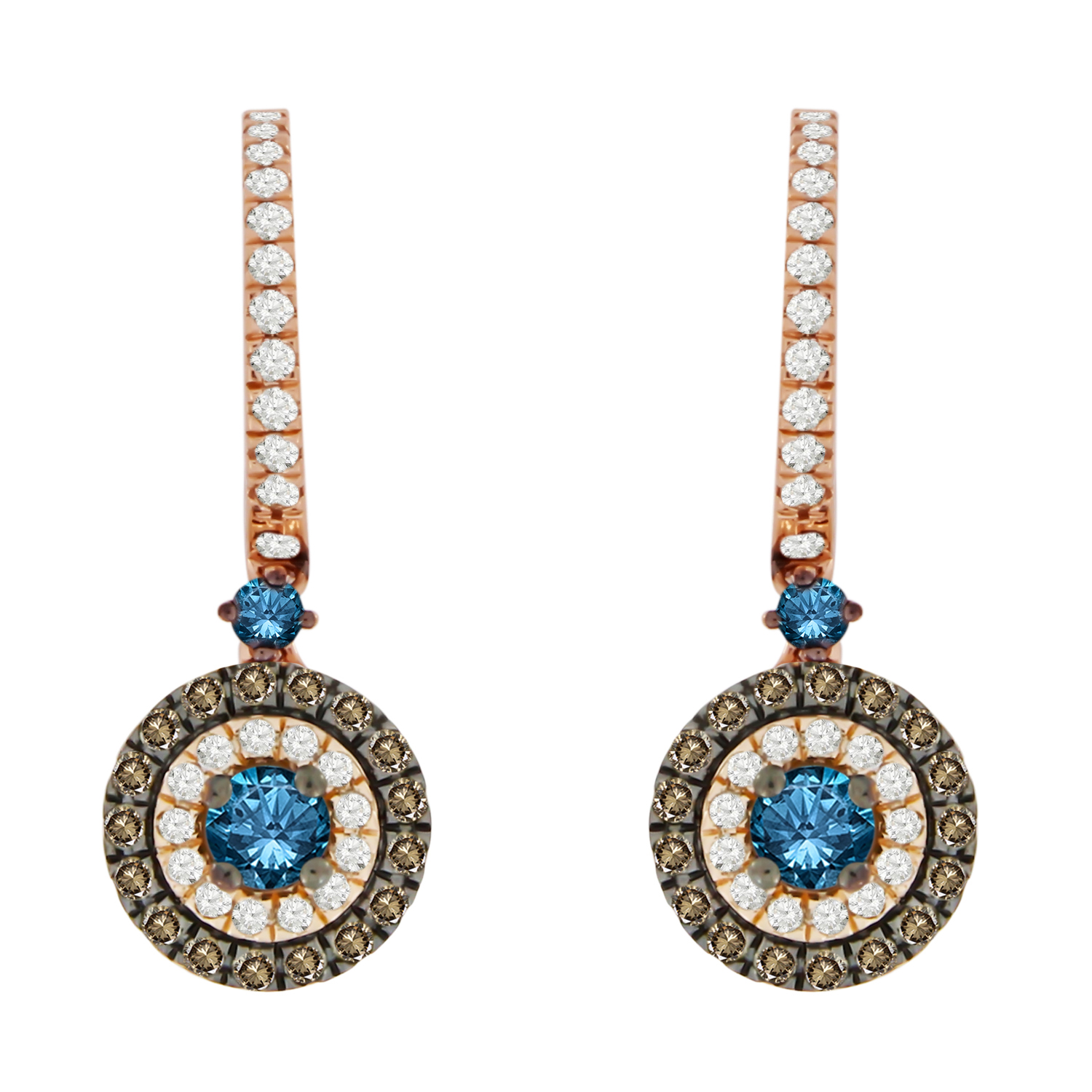 LADIES EARRINGS 1.00CT BLUE SAPPHIRE ROUND/DARK BROWN DIAMOND 14K ROSE GOLD